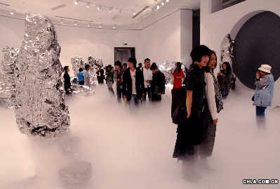 展望在美術館中廳里擺放了一組大型假山石,它們構成了一個完整的園林景觀。為了營造中國古典園林的氣息,現場還用干冰制造了煙霧。在騰云駕霧中,耀眼的不銹鋼園林,不似人間所有。此次展覽還循環播放展望在特定空間實施藝術計劃的錄像裝置、影像記錄等,除此之外,還有一些戶外大型作品以及圖片“鏡花園”系列,展覽比較全面地展現了藝術家十幾年來以“烏托邦式造園”為主題的藝術實踐。