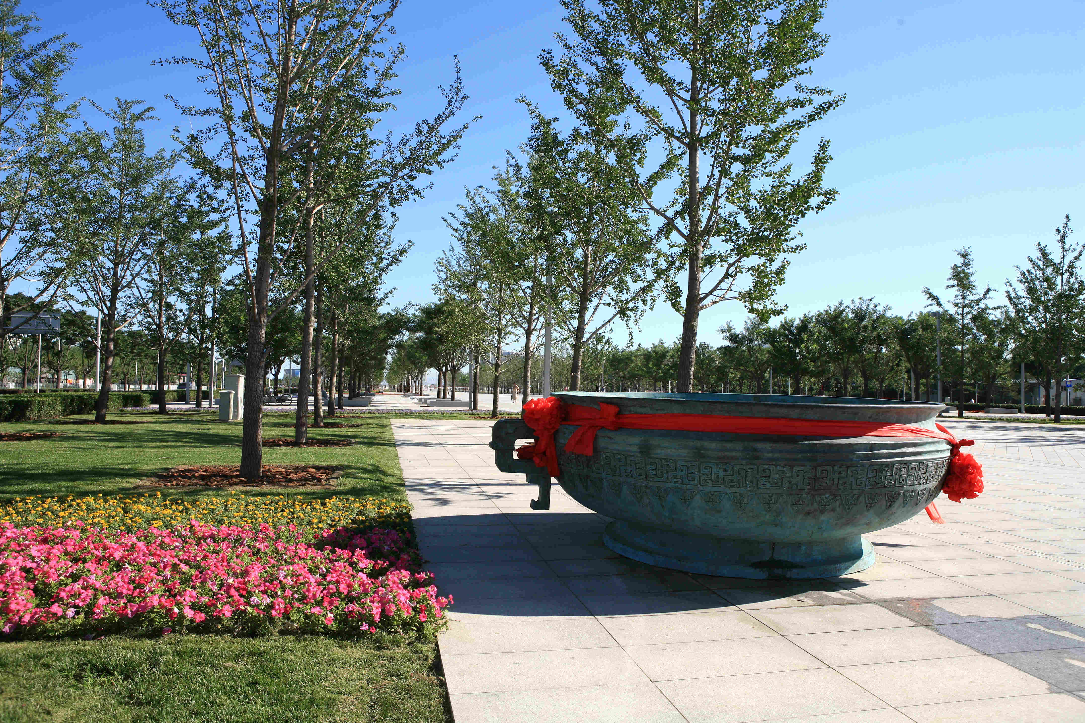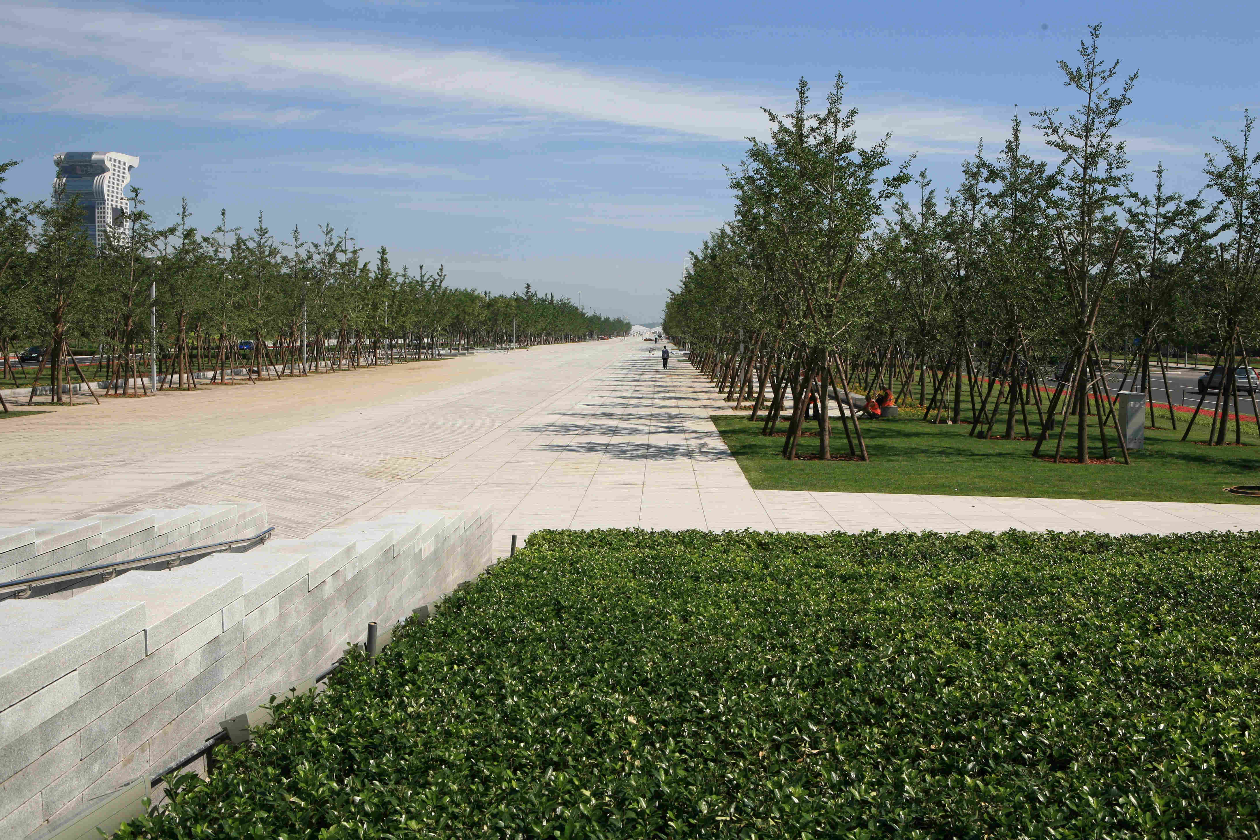民族大道屬于奧林匹克公園綠化工程的一部分,當初定建設方案時,奧林匹克公園景觀規劃總牽頭單位要求在御道兩側只能各種一排落樹,據說是有一位規劃界的老同志要求不遮擋中心區特別是鳥巢和水立方的景觀,而且希望最好別種喬木;而我們堅決要求各種三排落葉樹,理由是中國園林規劃中欲揚先抑的手法,讓人們從民族大道向北走,先隱約看到鳥巢和水立方的影子,一到北辰橋區,豁然開朗,更有利于表現兩個建筑的雄偉壯觀(中國風景園林設計中心老夏說)。經過了幾輪博弈難以定奪,最后有一天開會后,我直接帶圖找到了主管副市長陳鋼同志。陳市長巧妙地讓我們試種,最后認可了我們的建議。在民族大道竣工儀式的臺上,2008工程辦公室戴孟東副主任扭頭對我悄聲說:“當初定三排樹是太對了,否則哪里有今天的效果!8月份大太陽一照,老百姓沒處躲沒處藏還不罵娘?”