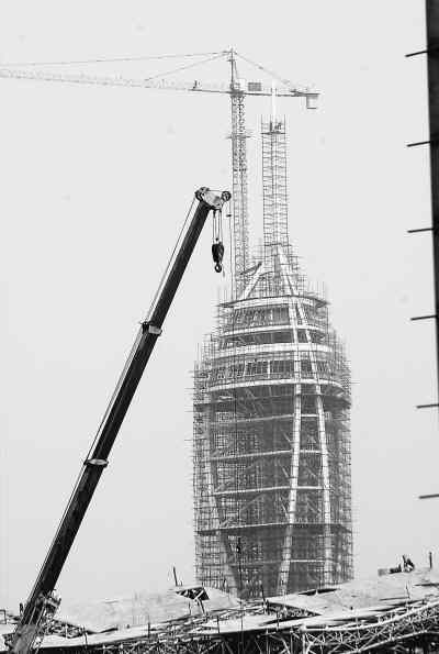 海口千年塔已被“穿上”腳手架和綠色防護(hù)網(wǎng)“外衣”,拆除在即。(彭桐攝)