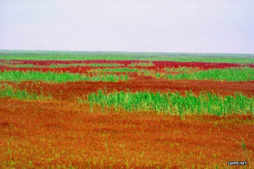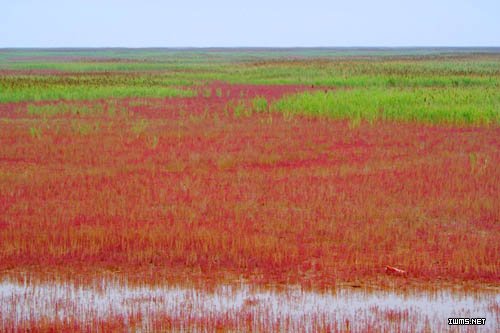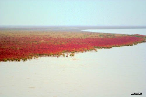 形成“紅地毯”的植被俗稱黃須菜,是一種耐堿性極強的種生植物,每年夏秋時節,原本青綠的黃須采開始逐漸變紅,最后全部變為紅色,漫川遍野、紅紅火火,遠遠望去猶如片片紅色的地毯,紅地毯因此而得名。