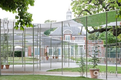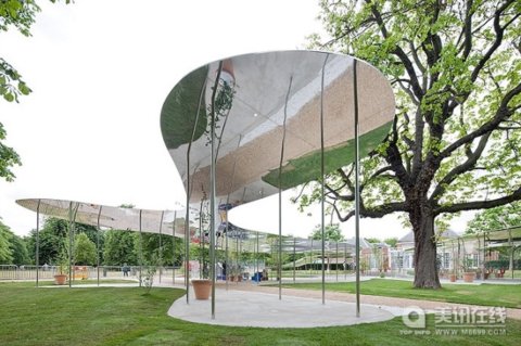 ![]() ![]() ![]() 自2000年以來,英國倫敦的蛇形畫廊每年都會邀請一名世界知名的建筑師在畫廊前的草地上設計建造一個臨時的連廊。而09年的建筑小品是由SANAA公司的日本建筑師Kazuyo Sejima和Nishizawa設計。這個連廊建筑于7月12日對公眾開放,一直到10月18日結束。連廊座落在倫敦海德公園的草坪上,主要是用來舉辦一系列活動,如表演、座談會、電影放映和蛇形畫廊的詩文接龍。另外,亭子附近會開一個小的咖啡店。 連廊是一個波浪形的鋁質結構,下面用多根精巧的小柱支撐。從天空俯視,可以看到這個建筑是一個蜿蜒的形狀,像是一縷輕煙,完美地和周圍環(huán)境融合在一起。金屬鋁可以反射出樹木、地面和天空,給人帶來一種特殊的混合感受。 歷年邀請的建筑師依次是2000年Zaha Hadid;2001年Daniel Libeskind和Arup;2002年伊東豐雄和Arup;2003年Oscar Niemeyer; 2004年荷蘭的MVRDV(因故未能完成);2005年álvaro Siza、Souto de Moura、Cecil Balmond以及Arup;2006年Rem Koolhaas、Cecil Balmond和Arup;2007年Olafur Eliasson和Kjetil Thorsen;2008年的Frank Gehry。