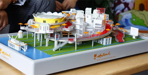 在以“快樂街”為主題的荷蘭館中,分布著一個個小型展館,魏偉勵說,漫步在“快樂街”上,參觀者將經過一棟棟“小房子”,感受到從這些小型展館傳遞出來的信息,那就是荷蘭的創新,文化和持久性發展的理念,同時,也將體驗到追求更美好生活所帶來的快樂感。其中一個主要小型展館的主題為水,參觀者將會看到水被過濾的過程,并喝到由此產生的純凈水。而另一座皇冠型的建筑,則將作為貴賓室,在那里將舉行一系列商務活動。