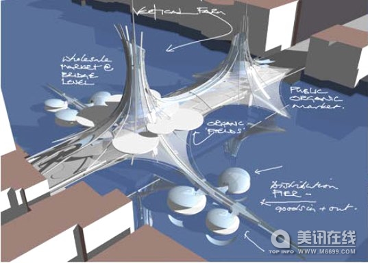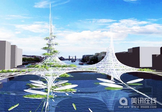 早在中世紀,倫敦大橋就是一個熱鬧的場地,大橋兩端布滿了建筑和市民,它是人們和車輛穿越泰晤士河的一條重要通道。不過現在這條大橋已經不像從前了,因為有很多新的大橋建造起來。甚至,其中有一條大橋還賣給了一個富有的美國人,然后搬遷到美國亞利桑那州的哈瓦蘇河市上。 前段時間,Worshipful Company of Chartered Architects公司和英國皇家建筑師協會一同舉辦一個設計比賽,為倫敦大橋設計一個新的面貌。獲獎作品就是Chetwood Architects的垂直農場和公共市場。 參照舊大橋的特點,Chetwood的設計不僅能讓倫敦大橋成為一個中心聚集場所,同時也能成為一個商業場所。新設計的大橋,不僅出售食品,同時也生產食品。大橋的中心元素是垂直農場和商業中心,商業中心內有新鮮食品市場、咖啡店、飯店和旅店。另外還有一個和大橋相連的水上平臺,可以通過水路運輸和販賣商品,甚至還能利用水培法栽種更多的食物。大橋兩端各有一個農產品市場,一個是批發市場,另一個是公設市場。 除了有機農場外,大橋還利用到可持續性能源生產、節水措施和節能控溫技術。首先,垂直農場像冷卻塔一樣工作,從大橋底層吸入冷空氣,然后在頂部呼出熱空氣。自然通風也能讓頂部的垂直軸風力渦輪機工作。太陽能加熱系統能生產熱水,而太陽能光電板則能為農場供電,多余的熱能可以提供給零售商。收集到的雨水會存儲起來,或者在農場內使用,灰水經過處理可以回收使用。 評委們是這么評論Chetwood的設計作品:“這是一個非常出色的方案,構思巧妙,考慮周全。不管是在建筑方面,還是在場地環境方面,它都做得非常出色。這個設計考慮了周圍建筑,并且把這些建筑也牽涉進來,同時它還充滿了有趣的生態理念。因此,它在我們評委團中得到了一致的認可!