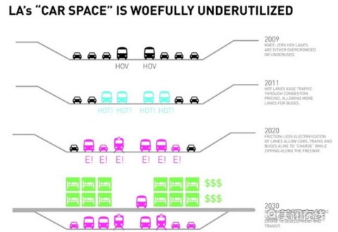 Go Mixed-Modal 2000年,洛杉磯地鐵曾冒險制造一種像地鐵一樣的公交車來提升客運量和交通效率,這種車叫The Metro Rapid。Mixed-modal則更大膽地認為任何公交車在其線路的特定地點都有潛力變得“本地”、“迅速”、“高速”,從而靈活地服務交通需要。 使用設計好的或是現(xiàn)有的鐵路模式,以及采用新型低摩擦電子動力分配裝置技術和鐵路、公路混合行駛路段,公交車進入分段的高速車道也能變地“高速”起來。 ![]() ![]() ![]()