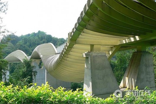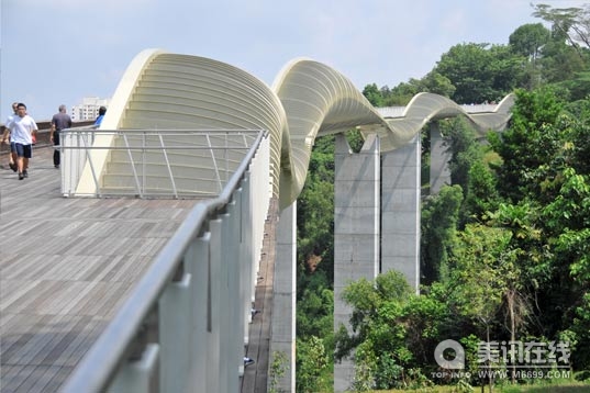 ![]() ![]() ![]() 如果你喜歡我們對紐約高架公園的報(bào)道,那直落布蘭雅公園中的高空走廊會(huì)把你帶向一個(gè)更高的高度。該公園位于新加坡,公園里的那個(gè)飛越式的走道就是你在電影里看到的連接各個(gè)山洞的古代繩索橋的現(xiàn)代懷舊版,從這里你可以看到樹頂部的風(fēng)景,這種體驗(yàn)可是非常難得的,因?yàn)樵谝郧爸挥泻镒硬拍芸吹健_@些懸在空中的走道還有橋梁,并不是左右搖晃的。事實(shí)上,它們設(shè)計(jì)優(yōu)雅并且構(gòu)造精確,即使你在公園的最高處,你也不會(huì)有暈眩的感覺。 直落布蘭雅的景色非常壯觀,是因?yàn)樗诮ㄔ爝^程中卻本著尊重自然的態(tài)度。其它的公園通過砍伐樹木來制造公共空間,并將瀕臨滅絕的動(dòng)物的家搬到這里。直落布蘭雅的設(shè)計(jì)完全保留了自然景觀,所有設(shè)施都建造在景觀周圍。此外,這些網(wǎng)狀的道路形成了一個(gè)開放的空間。亨得申波浪橋(Henderson Waves)(新加坡最高的步行天橋)以及亞歷山大拱橋(Alexandra Arch)都是最讓人驚嘆的部分。每晚,亞歷山大拱橋上都閃耀各種讓人眩目的顏色---不停變化的LED燈。 在這個(gè)枝葉繁盛的樹頂天堂里,你可以看到生活在這里的各種的野生動(dòng)物,例如,松鼠、太陽鳥、鴿子、蜥蜴以及白鹮。事實(shí)上,研究者經(jīng)常到附近的麥里芝吊橋(HSBC Treetop Walk)去研究雨林樹冠,但是如果沒有這個(gè)獨(dú)特的空中建筑物,那里也根本不容易進(jìn)入。 在自然中,你也可以非常容易的看到新加坡都市的熙攘與喧囂,游客在公園的許多地方都可以看到新加坡全景,這也是在大多數(shù)自然保護(hù)區(qū)中沒有的獨(dú)特景觀。通過將建筑融入到綠色空間和喧囂的城市中,而不是將其在兩者中分開,直落布蘭雅山公園向我們展示了一個(gè)成功的將自然與建筑結(jié)合得真實(shí)例子。