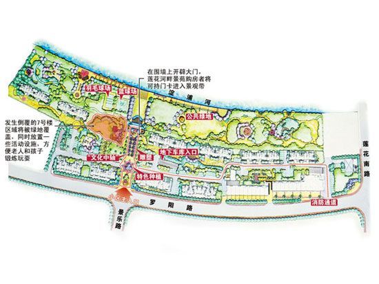 《蓮花河畔景苑景觀設(shè)計(jì)概念方案》(草案)正待批準(zhǔn),不排除進(jìn)一步修改可能。劉建平 制圖 昨日,上海萬(wàn)科房地產(chǎn)有限公司向發(fā)生在建樓房倒覆事故的蓮花河畔景苑小區(qū)購(gòu)房者公布了重新設(shè)計(jì)的小區(qū)景觀設(shè)計(jì)草案。小區(qū)總體綠化面積將比以前提升25%左右。 50位業(yè)主聽(tīng)現(xiàn)場(chǎng)講解 昨日11時(shí)30分左右,署名為“政府律師”的發(fā)帖人通過(guò)設(shè)置在閔行區(qū)政府網(wǎng)站上的“蓮花倒樓事故處理多方溝通平臺(tái)”發(fā)出通知。通知稱(chēng),經(jīng)上海萬(wàn)科積極推進(jìn),《蓮花河畔景苑景觀設(shè)計(jì)概念方案》(草案)已完成,F(xiàn)定于2009年8月27日14時(shí)至15時(shí)于上海市西南工程學(xué)校向購(gòu)房者公布,并由項(xiàng)目景觀設(shè)計(jì)師現(xiàn)場(chǎng)講解。早報(bào)記者粗略統(tǒng)計(jì),參與昨日現(xiàn)場(chǎng)講解的購(gòu)房者約有50位。 7號(hào)樓將被綠地覆蓋 受萬(wàn)科委托負(fù)責(zé)小區(qū)景觀設(shè)計(jì)的棕櫚景觀規(guī)劃設(shè)計(jì)院項(xiàng)目負(fù)責(zé)人介紹,發(fā)生倒覆的7號(hào)樓區(qū)域?qū)⒈痪G地覆蓋,同時(shí)放置一些活動(dòng)設(shè)施,方便老人和孩子鍛煉玩耍。此外,在新景觀設(shè)計(jì)草案中提及,小區(qū)將完全轉(zhuǎn)變?yōu)槿塑?chē)分流的通行方式。倒覆事故發(fā)生前的設(shè)計(jì)方案中鋪設(shè)在建筑物之間的絕大部分瀝青道路將被綠化覆蓋。小區(qū)內(nèi)僅留一條東西走向的機(jī)動(dòng)車(chē)道路供消防車(chē)通行。購(gòu)房者的私家車(chē)則將直接通過(guò)大門(mén)駛?cè)氲叵萝?chē)庫(kù)。 不過(guò),萬(wàn)科提及,地下車(chē)庫(kù)的設(shè)計(jì)方案基本不做調(diào)整,但會(huì)增設(shè)施工復(fù)核環(huán)節(jié)以確保質(zhì)量。 同時(shí),設(shè)計(jì)者為小區(qū)增加了一條“文化中軸”道路,該道路將設(shè)置很多傳統(tǒng)文化設(shè)施和裝飾。人們通過(guò)此條道路,可從羅陽(yáng)路穿越小區(qū),直達(dá)淀浦河邊的設(shè)計(jì)中的公共綠地區(qū)域。該道路位于倒覆樓旁邊,也“占用”了原來(lái)部分7號(hào)樓區(qū)域。 居民持門(mén)卡進(jìn)景觀帶 在蓮花河畔景苑和淀浦河中間區(qū)域,將建設(shè)50米的沿河公共綠化。這條景觀帶上,將建有羽毛球場(chǎng)、半個(gè)籃球場(chǎng)供群眾鍛煉。棕櫚景觀規(guī)劃設(shè)計(jì)院項(xiàng)目負(fù)責(zé)人表示,根據(jù)原方案,小區(qū)與景觀帶雖近在咫尺,但卻有圍墻相隔。而新方案則在圍墻上開(kāi)辟大門(mén),蓮花河畔景苑購(gòu)房者將可持門(mén)卡進(jìn)入景觀帶。 為了提升整體景觀效果,設(shè)計(jì)者還將小區(qū)劃分為運(yùn)動(dòng)建設(shè)、娛樂(lè)天地等幾大區(qū)域。萬(wàn)科及棕櫚均表示,人車(chē)分流的通行方式、大面積綠化、精致小品、噴泉,將大大提高小區(qū)檔次。新設(shè)計(jì)方案的綠化面積比原有提高25%左右。而如能最終成型,小區(qū)將在滬上同類(lèi)公寓住宅中屬于上乘。不過(guò),萬(wàn)科強(qiáng)調(diào),整個(gè)方案正在等待相關(guān)部門(mén)批準(zhǔn),不排除進(jìn)一步修改的可能性。 早報(bào)記者獲悉,未倒覆樓購(gòu)房者已經(jīng)有近半就解決方案有了初步選擇意向。而7號(hào)樓全部42戶(hù)購(gòu)房者中,也有10余戶(hù)確定了選擇意向。