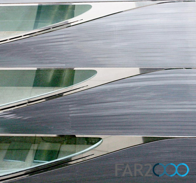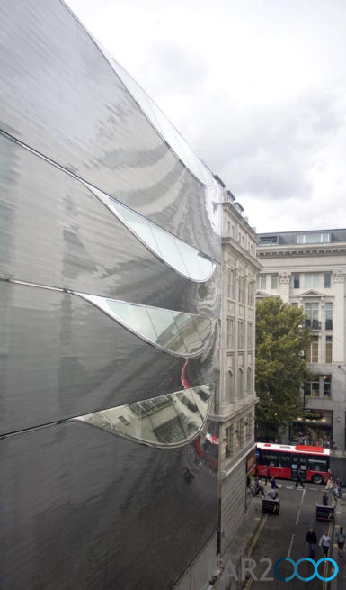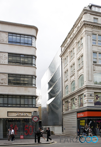 據9月14日報道,Amanda Levete事務所為倫敦牛津街的一座新辦公樓設計了一座非常精巧的雕塑般立面,采用的是高質量的船身技術。 由于這里是主要的購物街,狹窄的街道限制了日光的獲取。在受到Lucio Fontana藝術作品的啟發后,該事務用大塊玻璃切割開鋁制外皮,朝向天空,盡量將自然光照引進辦公空間。 立面采用了彎曲的鋁制輪廓線,并就地組裝。自我清潔的玻璃和隱藏的溝沿使得立面不需要多少維護。鋁制條帶的棱角反射出天空和街道,使之在牛津街上也能一眼望到。 建筑的底層夾雜著玻璃、網格和雙色薄膜,用光學纖維營造出視覺上的路徑,并在多少有些空白的立面上打造變化多端的圖案。