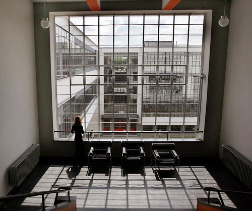 7、匈牙利家具設計師馬歇·布勞耶(Marcel Breuer)在1926年設計的“瓦西里椅”(Wassily)。沃爾特·格羅庇烏斯要求“包豪斯學校”積極涉足技術和工業。 在戰后分成兩個國家的德國,東德和西德都對“包豪斯學校”的遺產提出要求。后來,有批評家指出,這些丑陋的公寓樓和預制安裝的建筑物,是“包豪斯建筑學派”的“大規模生產房屋的觀點的直接結果。但這些使“包豪斯學校”非神秘化的嘗試,從未真正成功過。 在2009年,“包豪斯學校”的周年紀念,似乎是每一個人都在贊美“包豪斯學校”,將這個學校作為一個對以后發展的建筑設計有重大影響的實驗室。它被稱為一個巨大的、有趣的工作室,它幾乎是隨便地就弄出一項設計創新,將審美學帶到普通的生活中。但實際上,它非常復雜、矛盾,比它的名聲更突出。 由德國建筑師沃爾特·格羅庇烏斯完成的真實的業績和他的支持者,承認和暴露了建筑與設計的社會政治和道德的力量。他們希望運用“一般的條件”發揮“有效的影響”,創造一個更好的世界,并且讓所有這些變成“全體人民關心的東西”。 8、在德紹的“包豪斯學校”內景。這幢建筑物現在被“聯合國教科文組織”列入“世界遺產名單“。 作為政治上的建筑學概念,也是“包豪斯學校”的一種概念。因為它具體地設計生活環境,并且會引起爭議和反對。 當然,使世界變得更好的愿望,現在經常被認為是有缺陷的。但也許正是回到這種原創的精神的時候。“包豪斯學校”的繼承者——“包豪斯德紹基金會”(Bauhaus Foundation Dessau)和“魏瑪包豪斯大學”(Bauhaus University of Weimar)可能會很好地繼承“包豪斯學校”的創新方法和創新精神。 至少在德紹,這個周年紀念被用來作為一個新的開始。柏林建筑師菲利普?奧斯瓦爾特(Philipp Oswalt)在3月份將擔任這個周年紀念的導演。他呼吁更多的承諾,并且讓學校與社會的關系變得更加密切。