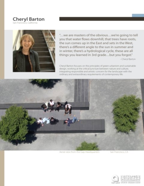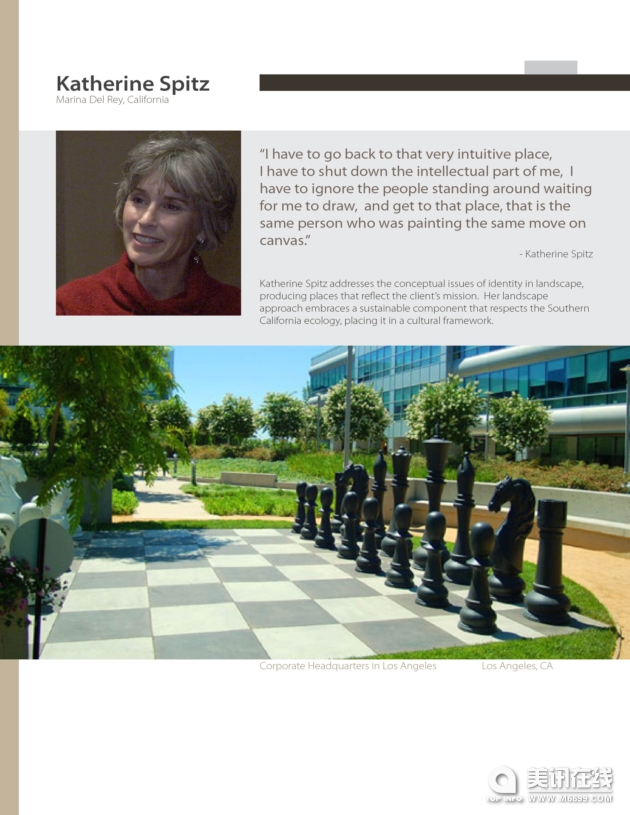 設計師:Robyn Newkirk,Pavel Petrov,Carolann R.Stoney(加州Pomona加利福尼亞州立綜合技術大學) 指導老師:Philip N.Pregill,Andrew O.Wilcox,Susan Mulley,Chris Aykanian,James Becerra 獲獎:2009年ASLA學生獎信息類榮譽獎 “一個慶祝西岸景觀設計中女性成就的好作品,作品價值非常好,它向觀眾清晰的傳達了信息。”——2009年ASLA學生獎評審團 項目說明 Women in the Dirt:塑造加州景觀的設計師是一部紀錄片,片中采訪了如今在加州最有才干的七位女性設計師。影片的目的是提高景觀設計師的專業性,并且展示這些女性設計師的作品,從私家花園到大的公共項目和政府項目,這些作品導致了公共政策的改變,這些女性正在塑造加州。 ![]() ![]() ![]() ![]()
