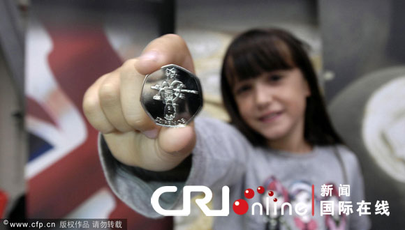 2009年10月12日消息,英國加迪夫,9歲女孩Florence Jackson展示她設計的2012年倫敦奧運會紀念幣。這款紀念幣面值50便士,是英國皇家鑄幣廠與孩子的首次合作。
