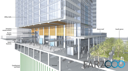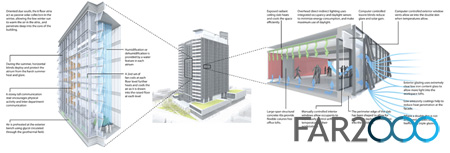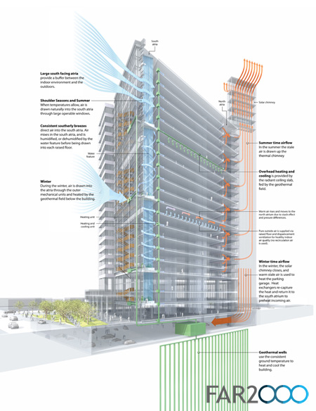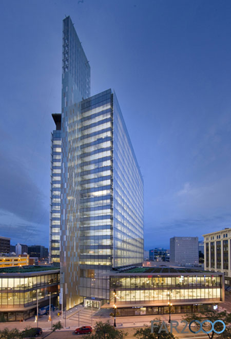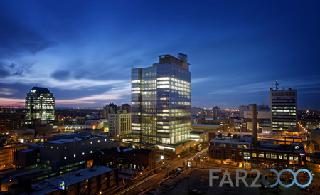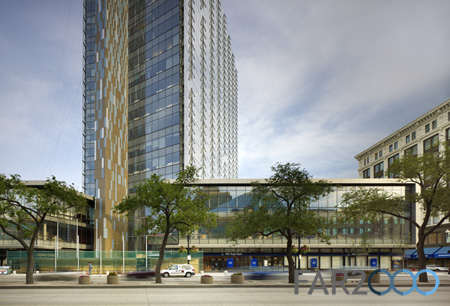 據10月5日報道,Manitoba Hydro Place是加拿大第四大能源公司的新總部大樓,也是加拿大最可持續的建筑。位于Winnipeg市中心的大樓面積達69.5萬平方英尺,昨天正式開張,從節能方面贏得很高的贊譽。其能耗只相當于普通辦公樓的四分之一,并且需要抵抗這里的極端氣候條件。最近,高層建筑委員會(the Council for Tall Buildings)將其評選為美洲最佳建筑,并有望在月底競爭該組織的“世界最佳建筑”獎。 由多倫多的Kuwabara Payne McKenna Blumberg事務所和Winnipeg的Smith Carter事務所設計的這座總部高23層,主要通過被動方式來節能,例如材料、朝向等特點,為建筑制冷和采暖提供大部分能源。建筑的兩座塔樓形狀像大寫的字母A,在北部頂端相會,而在南部的底端分開,為的是捕捉充足的陽光。張開的部分容納了一系列冬季花園,就像肺一樣吸納進新鮮的戶外空氣,并送到工作場所。每一座中庭都設置了瀑布,根據季節加濕或干燥空氣。377英尺高的“熱煙囪”坐落于主入口,形成了天際線上的標志,也是被動通風的一個關鍵系統。緊密的熱循環系統為辦公室采暖和制冷。建筑頂部是綠色屋頂,建有可達的露臺。 KPMB事務所利用簡單的概念和先進的技術為Winnipeg塑造了一座標志性建筑和環保方面的模范。