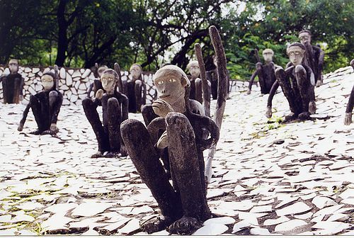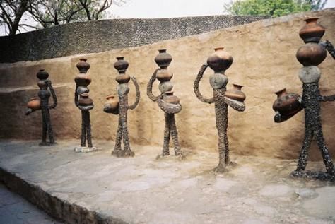路徑兩側是近5000件用碎陶瓷片、酒瓶蓋等堆砌成的武士、舞女以及動物的雕塑。抽象的現代派藝術讓人流連忘返,渾然不覺塑像所用的陶瓷片上還清晰地印著馬桶品牌的商標。