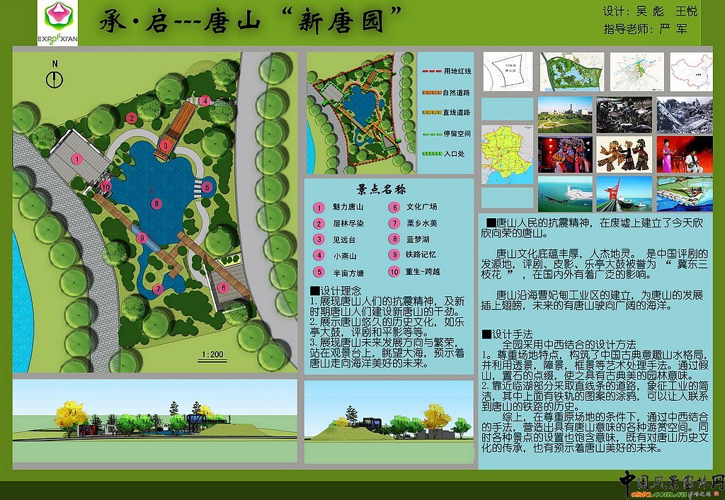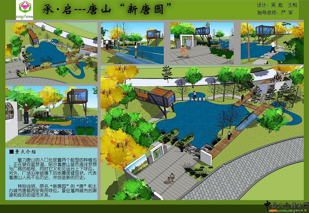 中國風景園林網訊 為配合2011西安世界園藝博覽會唐山展園的設計,提高南京林業大學風景園林專業大學生的規劃設計水平,鼓勵和激發大學生的創造性思維,引導大學生對風景園林學科和行業發展前沿性問題的思考,南京林業大學風景園林學院聯合河北省唐山園林局舉辦"2011西安世界園藝博覽會唐山園設計競賽"。以下為第四名作品。 承·啟--唐山“新唐園” 唐山人民的抗震精神,在廢墟上建立了今天欣欣向榮的唐山。 唐山文化底蘊深厚,人杰地靈。是中國評劇的發源地,評劇、皮影、樂亭大鼓被譽為“冀東三枝花”,在國內外有著廣泛的影響。 唐山沿海曹妃甸工業區的建立,為唐山的發展插上翅膀,未來的有唐山駛向廣闊的海洋。 設計理念 1、展現唐山人們的抗震精神,及新時期唐山人們建設新唐山的干勁。 2、展示唐山悠久的歷史文化,如樂亭大鼓,評劇和平影等等。 3、展現唐山未來發展方向與繁榮,站在觀景臺上,眺望大海,預示著唐山走向海洋美好的未來。 ![]() ![]() 西安世園會唐山園設計一等獎作品 西安世園會唐山園設計三等獎作品