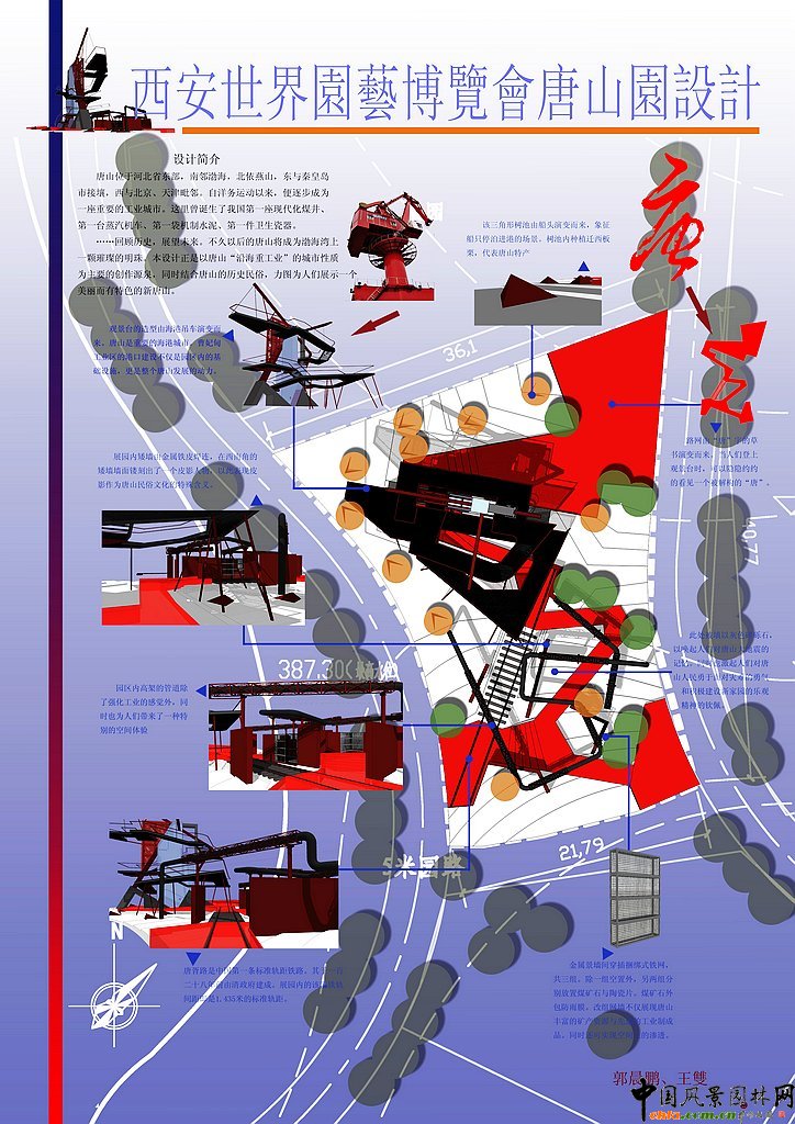 中國(guó)風(fēng)景園林網(wǎng)訊 為配合2011西安世界園藝博覽會(huì)唐山展園的設(shè)計(jì),提高南京林業(yè)大學(xué)風(fēng)景園林專業(yè)大學(xué)生的規(guī)劃設(shè)計(jì)水平,鼓勵(lì)和激發(fā)大學(xué)生的創(chuàng)造性思維,引導(dǎo)大學(xué)生對(duì)風(fēng)景園林學(xué)科和行業(yè)發(fā)展前沿性問(wèn)題的思考,南京林業(yè)大學(xué)風(fēng)景園林學(xué)院聯(lián)合河北省唐山園林局舉辦"2011西安世界園藝博覽會(huì)唐山園設(shè)計(jì)競(jìng)賽"。以下為第六名作品。 西安世界園藝博覽會(huì)唐山園設(shè)計(jì) 設(shè)計(jì)簡(jiǎn)介 唐山位于河北省東部,南鄰渤海,北依燕山,東與秦皇島接壤,西與北京、天津毗鄰。自洋務(wù)運(yùn)動(dòng)以來(lái),便逐步成為一座重要的工業(yè)城市。這里曾誕生了我國(guó)第一座現(xiàn)代化煤井、第一臺(tái)蒸汽機(jī)車、第一袋機(jī)制水泥、第一件衛(wèi)生瓷器。 ……回顧歷史,展望未來(lái)。不久以后的唐山將成為渤海灣上一顆璀璨的明珠。本設(shè)計(jì)正是以唐山“沿海重工業(yè)”的城市性質(zhì)為主要的創(chuàng)作源泉,同時(shí)結(jié)合唐山的歷史民俗,力圖為人們展示一個(gè)美麗而有特色的新唐山。 ![]() ![]() 西安世園會(huì)唐山園設(shè)計(jì)一等獎(jiǎng)作品 西安世園會(huì)唐山園設(shè)計(jì)二等獎(jiǎng)作品 西安世園會(huì)唐山園設(shè)計(jì)三等獎(jiǎng)作品