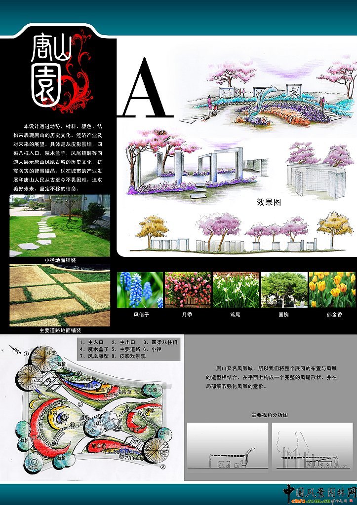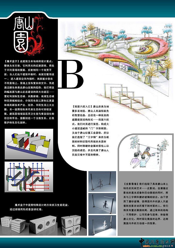 本設計通過地勢、材料、顏色、結構來表現唐山的歷史文化,經濟產業及對未來的展望。具體是從皮影景墻,四梁八柱入口,魔術盒子,鳳尾鋪裝等向游人展示唐山鳳凰古城的歷史文化,抗震防災的智慧結晶,現在城市的產業發展和唐山人民從古至今不畏困難,追求美好未來,堅定不移的信念。