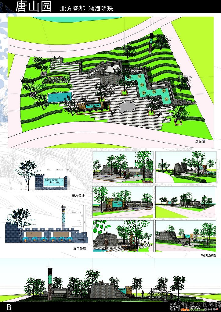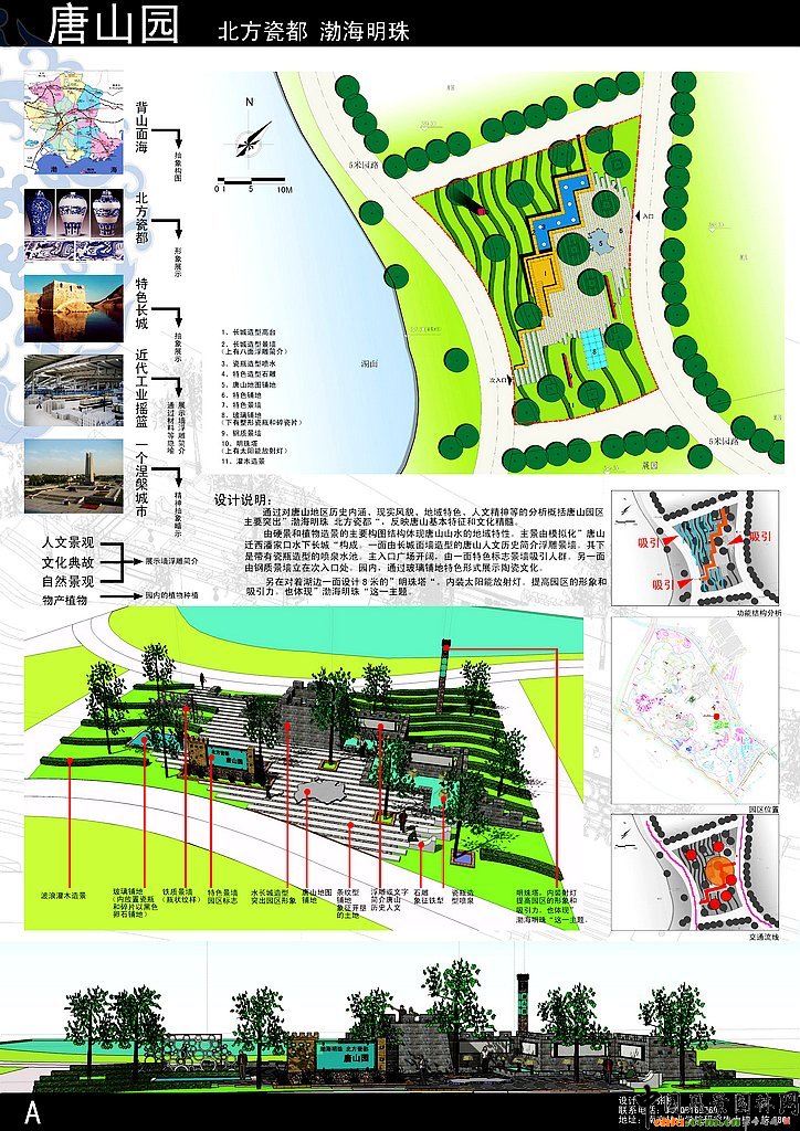 由硬景和植物造景的主要構圖結構體現唐山山水的地域特性。主景模擬化“唐山遷西潘家口水下長城”構成。一面由長城面墻造型的唐山人文歷史簡介浮雕景墻。其下是帶有瓷瓶造型的噴泉水池。主入口廣場開闊,由一面特色標示景墻吸引人群。另一面由鋼質景墻立在次入口處。園內,通過玻璃鋪地特色形式展示陶瓷文化。