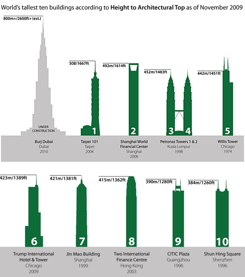 這種變更促使世界10幢最高建筑物的排列有稍微變化。由SOM建筑事務所設計的“迪拜塔”(Burj Dubai)將于最近開放,謠傳它的高度為2,684英尺,仍然是世界上最高的建筑物。但也由SOM設計的芝加哥的特朗普國際酒店大廈(Trump International Hotel & Tower)增加了27英尺,從第七位上升到第六位,取代了也由SOM設計的上海金茂大廈(Jin Mao Building)。 CTBUH最高建筑委員會主席彼得·韋斯曼特爾(Peter Weismantle)說:“在2007年,在知道‘迪拜塔’將成為世界上最高的建筑物之后,我們開會評論識別最高建筑物的標準和建筑物的排名。幾乎兩年以后的這個高度標準修改,反映了CTBUH最高建筑委員會對最近世界上高層建筑發展趨勢的認識。”