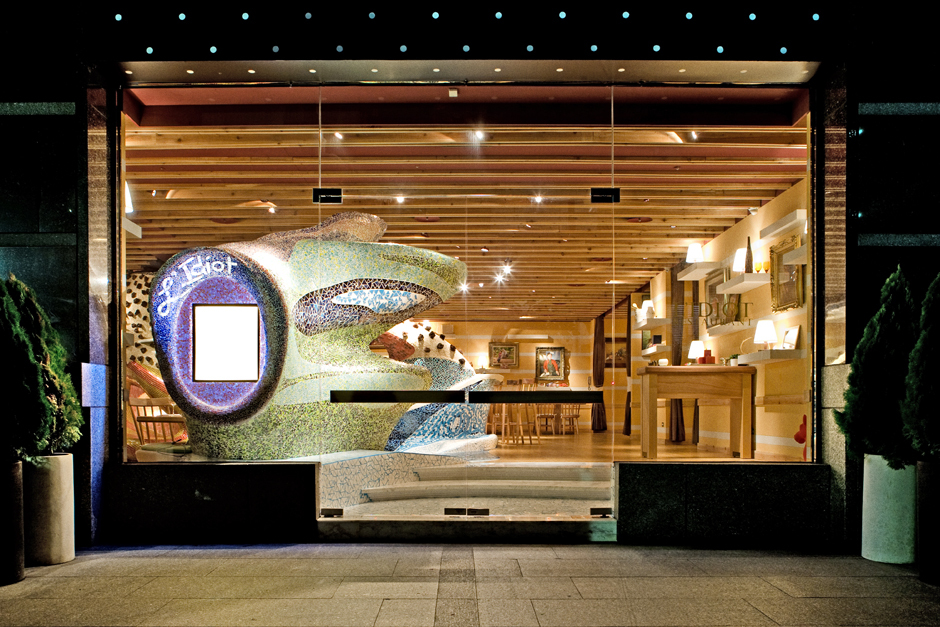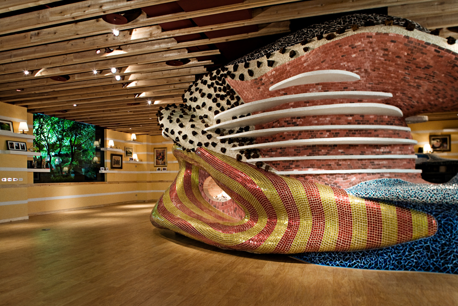 4.明日之城 這塊場地面積只有10*10,是建筑展的一塊附屬區域。由于材料和場地的限制,設計師用塑料做了一棵很大的"柳樹","柳樹"在風的作用下搖曳, 音響系統則播放著女人在哭的聲音。這棵"柳樹"看上去很像真的柳樹,人們用柳枝做項鏈、耳環等等,它成為了建筑展上的標志性物體。 ![]() ![]() ![]() 5.2011年西安國際園藝博覽會大師園 這個園子使用的主要材料是青磚,鏡子以及柳樹,利用拱形通道與鏡子的反射效果營造豐富的空間。 ![]() ![]() ![]() ![]() 6.臺北里帝歐餐廳 這是餐廳的內部設計,設計師試圖創造有趣的空間體驗,利用不同的形狀和顏色。這個設計給用戶以豐富的感官體驗。 ![]() ![]() ![]()