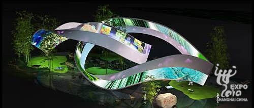 湖南館取名為“都市·桃花源”,建筑外觀像一尊巨大的動態雕塑,難得的是主體建筑的外圍與屏幕連成一體,將有魚翔淺底、落英繽紛、碧水綠草、竹林幽谷等景致在上面呈現。湖南館沒有像其他館一樣設置參觀路線,觀眾可以從該館的數個方位進出,隨意觀看。