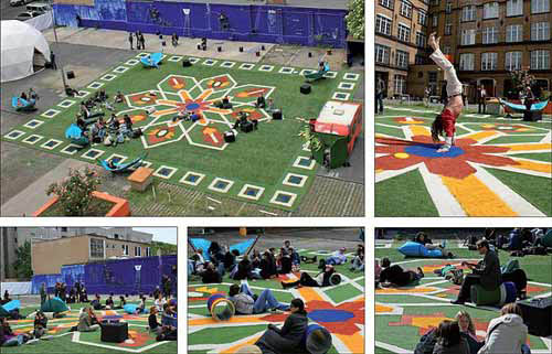 “你有看過會飛的魔毯嗎?” “有沒有聽錯,這不是在《一千零一夜》里才會出現(xiàn)的童話場景嗎?” “別大驚小怪了,現(xiàn)在真的有人把飛天魔毯設(shè)計出來了!” “那…它要怎么飛呢?” “怎么飛不是重點,厲害的是,它可是全世界唯一一個可以移動的飛行公園,這夠神奇了吧!” 會飛翔的移動式公園 飛天草毯基本上是一片巨型的人工草坪,以充滿東方風(fēng)情的波斯圖紋設(shè)計而成。共有18×32米和22×58米兩種尺寸規(guī)格,雖然面積龐大,但可以任意拆解、組裝,造就便利的運輸性。自2009年設(shè)計完成之后,飛天草毯已創(chuàng)下3個國家及8座城市的飛行紀(jì)錄,它曾到阿姆斯特丹參加Kunstvlaai藝術(shù)節(jié),也待過馬德里和柏林等歐洲大城,作為裝置展示以及供人們活動玩耍的公共空間。飛天草毯在今年還會陸續(xù)前往德國、匈牙利和土耳其等各國旅游,為當(dāng)?shù)爻鞘凶⑷刖G意盎然的休閑氣息,打造活力四溢的新公園生活。