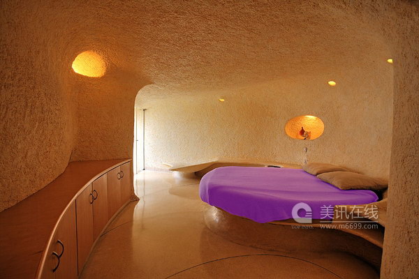 經過無數次修改后,形成了一個鸚鵡螺式的結構。居住在其中似乎像蝸牛一樣,從一個房間緩慢移動到另一個房間,頗似共生的化石住所。住宅中沒有任何劃分,在三維的和諧空間中你會發現第四維的動感,從樓梯盤旋而下的時候感覺就像軟體動物趴在植被上。