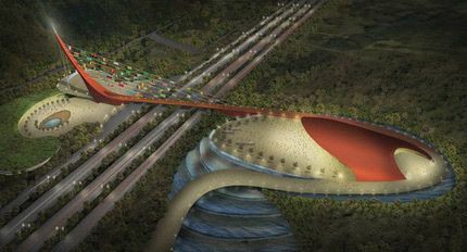這個“大門”跨過阿布賈和機場之間的主要公路 與他的像村莊一樣的“戲劇工場”比較,這個新的項目是一個高高聳立的抽象的形式,從傳統的弓豎琴和尼日利亞人的織布機獲得的靈感。它的中心裝飾品是一道位于聯系新首都阿布賈與機場的高速公路上方的人行橋,南北走向,象征國家的統一。 史蒂文-艾里克與項目建筑師帕特里夏-雷希(Patricia Rhee)及尼日利亞的特里亞德建筑事務所(Triad Associates)一道工作,在地面上安排了一些附屬設施,為藝術活動和娛樂提供一個場所,也作為會見當地官員的的禮儀場所。 這個混凝土的建筑和它的高塔將采用本地泥土的顏色——暗紅色。彎曲的人行橋和斜道將組合在一起,讓人們從一個小瀑布的上方通過。這個98英畝的場地的設施,將包括一個市場、一個運動場、一個健身房和一個兒童動物園。從6英里遠的市中心有公共汽車到達這里。