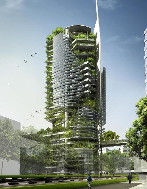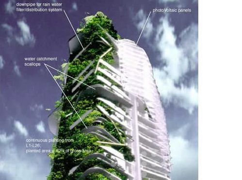 圖5:圖中有許多斜坡,該環保大樓的公共入口坡道可將各個樓層和街面相連。 圖6:圖左圖右分別取自兩個視角。據悉,環保大樓有26層高,設有光電板且自然通風。 圖7:高聳的環保大樓能夠收集雨水,結合大樓中的供水系統,將這些水用于沖洗沼氣池和廁所,由此,大樓55%的用水可自給自足。