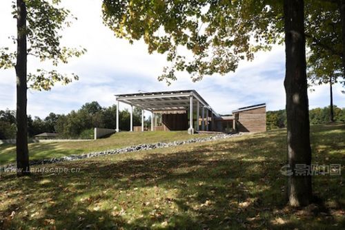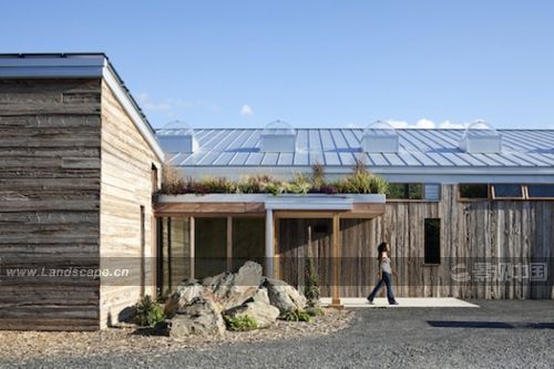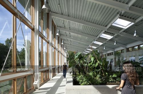 由BNIM Architects設(shè)計(jì)的Omega可持續(xù)生活中心——北美最節(jié)能的建筑之一。 該建筑能量收支平衡:所有的能量來(lái)源于現(xiàn)場(chǎng)資源,大部分來(lái)自太陽(yáng)能電池板。 “生態(tài)機(jī)器”,包括一個(gè)人工濕地,將該建筑的廢水凈化后排進(jìn)土地。