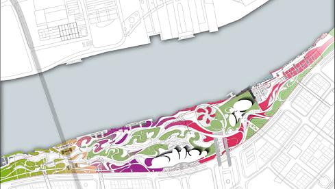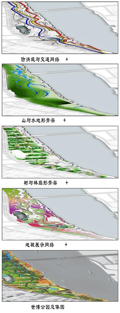 設計構思中,由防洪堤和交通網絡引發創作靈感,進一步聯想到山水自然線條的構圖形式,最終確立中國扇的上層植物結構形式配以流暢的地被網絡,形成一輪黃埔江邊亮麗的植物虹。橫向上強調布局的弧線分區與直線守邊相結合,豎向上通過對風向、遮蔭及視線等因素的綜合考慮,穿插形成整齊的南北向條狀林地。抬升的扇形基地比擬為折扇的扇面,按風向走勢而特意設置的喬木引風林比擬為扇骨,這樣整個灘的景觀構成了一幅生動而賦有韻味的中國水墨山水畫。(如圖2)