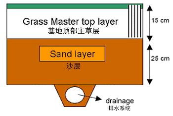 圖7 在世博公園耐踐踏草坪設計中主要通過三個標準加以衡量:混合草種、基地和草坪維護管理。草種混播:綜合考慮上海的氣候(氣溫從冬季的-8°C到夏季高濕度的35°C),病蟲害的風險以及草坪的再生能力,將混合草坪的成分定為狗牙根和高羊毛。基地:具有較高的滲透性和良好的排水系統,至少有三米的厚度,包括一層M3C砂層,厚度25-30cm;一層有機物填充的運動技術層(主草層),厚度15cm;附加的材料可以加強穩定性,最后在頂層種植草皮。維護管理:草坪的噴淋系統能定時進行灌溉,比如POP-UP系統。它能跨越草坪上的任何障礙物,而不需要借助拖拽水管等措施來實現灌溉,同時用規律的施肥來保持耐踐踏草坪的營養。(如圖8、9)