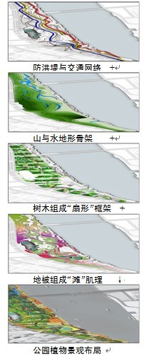 圖 1 設(shè)計(jì)理念分析 1、植物景觀系統(tǒng)規(guī)劃布局特點(diǎn) 植物景觀系統(tǒng)規(guī)劃主體結(jié)構(gòu)形式銜接城市外部環(huán)境 城市道路網(wǎng)絡(luò)形成城市肌理骨架,將上海世博會(huì)公園周圍的城市地域分成條狀地塊指向黃浦江,喬木是構(gòu)成大尺度綠地植物景觀以及同樣面積中獲得綠化葉面積指數(shù)最大的植物材料,因此,在植物景觀整體結(jié)構(gòu)骨架設(shè)計(jì)中,通過(guò)對(duì)風(fēng)向、遮蔭及視線等因素的綜合考慮,以"扇骨形狀"布置喬木林,形成與江面基本垂直、喬木群落邊界完整、樹(shù)陣形式為主南北條狀林帶的骨架肌理體系。扇骨結(jié)構(gòu)尺度呼應(yīng)大尺度的城市空間,整齊的扇骨喬木種植體系與城市和園區(qū)規(guī)劃肌理協(xié)調(diào),將世博園區(qū)與黃埔江緊密銜接,有機(jī)地達(dá)到江與城的交融。行列種植方式和科學(xué)植物配置,有利于江面視線穿透和空氣的對(duì)流及凈化,并創(chuàng)造出特色鮮明的濱江景觀及序列性的植物景觀。