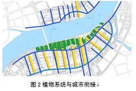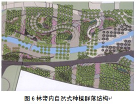 圖2 植物系統(tǒng)與城市銜接 植物景觀系統(tǒng)規(guī)劃配置模式漸變協(xié)調(diào)公園分區(qū)景觀 上海世博會(huì)公園植物景觀系統(tǒng)規(guī)劃圍繞著人流活動(dòng)及場(chǎng)所特征的變化而設(shè)置出與公園綠地分區(qū)功能結(jié)構(gòu)相吻合的植物景觀區(qū)域,分別為:空中立體花園景觀區(qū)、屋頂花園景觀區(qū)、人工林地景觀區(qū)、林帶地被景觀展示區(qū)、濕地景觀展示區(qū)、生態(tài)濕地植物景觀區(qū)。整個(gè)植物景觀系統(tǒng)規(guī)劃根據(jù)其所在地域地形的起伏、水體的穿越、人流的聚集等不同的因素,進(jìn)行該群落的主題設(shè)計(jì),由東向西通過(guò)人工配置模式逐漸向自然配置模式漸變,形成了對(duì)比統(tǒng)一的喬木林帶種植形式,組成形態(tài)規(guī)整、變化多樣、完美統(tǒng)一的系統(tǒng),將公園綠地分區(qū)與植物景觀區(qū)域協(xié)調(diào)一致,延續(xù)了植物景觀系統(tǒng)規(guī)劃體系"從人工到自然"的過(guò)渡。配置模式以喬木林帶邊緣完整性配置模式來(lái)"延續(xù)整體骨架",以喬木林帶內(nèi)部空間植物群落自然配置模式來(lái)體現(xiàn)自然景觀。