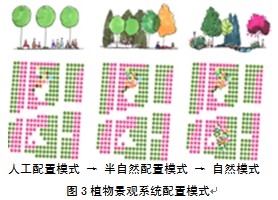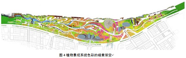 圖3 植物景觀系統(tǒng)配置模式 植物景觀系統(tǒng)規(guī)劃色彩冷暖序列體現(xiàn)世博會(huì)展氛圍 上海世博公園植物景觀系統(tǒng)規(guī)劃以"灘的形成"來(lái)創(chuàng)造變化豐富的自然植物群落,用灘的蔓延形成種植色彩的褪暈漸變,來(lái)展示世博會(huì)館展與觀賞演出的喜慶氛圍,以及體會(huì)自然生態(tài)景觀與回味工業(yè)歷史的靜思氛圍。利用公園綠地下層地被植物色彩的差異,在世博中心軸為中心區(qū)的區(qū)域選用較為強(qiáng)烈的暖色色彩植物進(jìn)行種植,兩邊的基地區(qū)域種植冷色色彩植物,由中心區(qū)向基地兩端過(guò)渡的綠地區(qū)域,種植的植物色彩強(qiáng)度與色相逐漸減弱,形成由中部暖色分別逐漸過(guò)渡到西區(qū)、東區(qū)冷色的序列景觀,創(chuàng)造出熱烈、和諧、溫和的氣氛,形成協(xié)調(diào)漸變的植物褪暈景觀體系。選擇運(yùn)用不同葉色和花色的地被植物,以及不同明度、彩度的差別構(gòu)成自然式種植群落結(jié)構(gòu),達(dá)到豐富多彩的調(diào)和圖案,其組成形態(tài)看似無(wú)序但又被無(wú)形的體系完美地統(tǒng)一在植物景觀系統(tǒng)中。