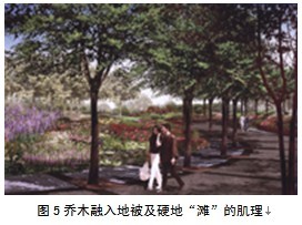 圖4 植物景觀系統(tǒng)色彩的褪暈漸變 2、植物景觀的群落配置 植物景觀的主體空間構(gòu)成 用"重地被,弱中層,強(qiáng)上木"的立體空間構(gòu)成模式,構(gòu)建出植物景觀設(shè)計(jì)的主體空間體系,解決了世博會(huì)議期間高容量、高密度人群對(duì)大量集散場(chǎng)地和大量的遮蔭需求,以及人們對(duì)開(kāi)闊空間、通暢視野、喜悅氛圍環(huán)境的要求。植物景觀通過(guò)注重下層花灌木及地被植物的合理配置,削減中層灌木體量,強(qiáng)化上層混交喬木林態(tài)勢(shì)的配置模式,也形成了獨(dú)特的上海世博公園綠地植物群落景觀的空間藝術(shù)形式。它利用簡(jiǎn)潔明快的喬木列陣和樹(shù)種多變的喬木種類,與曲折變化的地被色帶相銜接,結(jié)合地形的高低起伏和綠地植物所在設(shè)計(jì)區(qū)域的功能,形成一條條豐富而有韻律的林冠、林緣線,劃分出變換多樣的空間模式,起到美化和協(xié)調(diào)周邊環(huán)境作用,產(chǎn)生虛實(shí)結(jié)合的意境效果。在綠色草坪基調(diào)上渲染出豐富多彩的色塊,不僅視覺(jué)上自然活潑,創(chuàng)造出高低起伏、含蓄多樣的植物群落景觀,也擴(kuò)大了公園的園林空間。