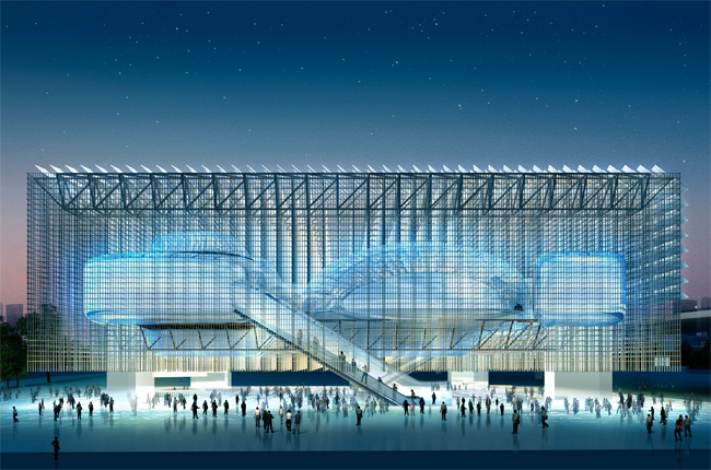 于是主辦方收集了許多舊光盤,進行清洗再造出新的聚碳酸酯塑料顆粒,制成LED 塑料管,并將這些塑料管制作成一張龐大的網格籠罩在建筑外墻面,這些半透明的塑料管不僅為整個場館添加了一些未來主義色彩。更奇妙的是,這些塑料管不僅容納了“魔方”的技術設備管線,還可以充作LED 燈,通過電腦程序調控隨著不同的節拍變幻出不同色彩。遠遠看去,在不同的光澤與色彩的變幻之下,整個建筑的外觀也會產生細微的變化。“這樣的設計,在視覺上有朦朧的夢幻效果,從實用性上也可以遮陽,這樣夏季時,參觀者在等候入場時可以不必完全暴露在烈日下。”設計方介紹說。