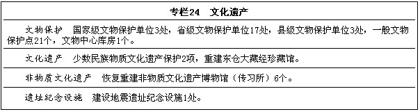 第三節(jié) 文化遺產(chǎn)保護(hù) 文物保護(hù)。對國家級、省級、縣級文物保護(hù)單位和重要文物點(diǎn)實(shí)施保護(hù)性清理、維修加固和修復(fù)重建。對館藏文物、寺內(nèi)文物進(jìn)行認(rèn)定和修復(fù)。維修加固和重建受損的博物館、文物庫房、文管所。注重文物保護(hù)與當(dāng)?shù)鼐用裆钐貏e是宗教生活的和諧共存,做好文物保護(hù)修復(fù)與開展傳統(tǒng)宗教文化活動的協(xié)調(diào)工作。 非物質(zhì)文化遺產(chǎn)保護(hù)。重點(diǎn)恢復(fù)重建受損國家級、省級非物質(zhì)文化遺產(chǎn)和博物館。培養(yǎng)民族民間文化傳人,加強(qiáng)卓舞、依舞、民歌、安沖藏刀鍛制技藝等的傳承。 地震紀(jì)念設(shè)施。保留必要的玉樹地震遺址,建設(shè)紀(jì)念設(shè)施。