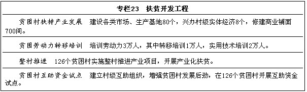 第二節(jié) 扶貧開發(fā) 貧困村產(chǎn)業(yè)扶持。依托當(dāng)?shù)刭Y源優(yōu)勢,建設(shè)高標(biāo)準(zhǔn)日光節(jié)能溫室,發(fā)展蔬菜等經(jīng)濟(jì)作物種植、馬鈴薯種植、畜牧業(yè)養(yǎng)殖。發(fā)展民族家庭手工業(yè)和小型農(nóng)產(chǎn)品加工業(yè),扶持貧困村、貧困戶建立綜合性農(nóng)貿(mào)市場和專業(yè)市場,多渠道增加受災(zāi)農(nóng)牧民收入。開展貧困村互助資金試點(diǎn)。 易地扶貧搬遷。對居住在生態(tài)環(huán)境惡劣、存在地質(zhì)災(zāi)害隱患等地區(qū)的貧困人口,有計劃地實(shí)施易地搬遷,集中安置,配套基礎(chǔ)設(shè)施建設(shè),扶持產(chǎn)業(yè)發(fā)展。 勞動力轉(zhuǎn)移培訓(xùn)。對青壯年勞動力進(jìn)行“雨露計劃”和實(shí)用技術(shù)培訓(xùn),開展以中長期培訓(xùn)為主的民族服裝加工、民族用品加工、機(jī)械修理、藏繡等各種專業(yè)的技能培訓(xùn),提高貧困群眾自我發(fā)展能力。