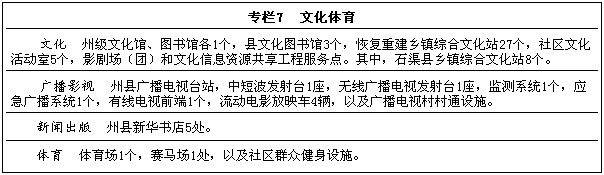第三節(jié) 文化體育 文化場(chǎng)館。恢復(fù)重建州、縣、鄉(xiāng)、村四級(jí)公共文化服務(wù)設(shè)施,重點(diǎn)恢復(fù)重建文化館、圖書(shū)館、影劇院及鄉(xiāng)鎮(zhèn)綜合文化站、村文化室、社區(qū)文化中心。恢復(fù)重建文化信息資源共享工程。統(tǒng)籌建設(shè)州縣同城文化設(shè)施。 廣播影視。恢復(fù)重建廣播電視功能,重點(diǎn)恢復(fù)重建廣播電臺(tái)、電視臺(tái)和無(wú)線廣播電視發(fā)射臺(tái)站、有線電視網(wǎng)絡(luò)、監(jiān)測(cè)臺(tái)站,以及廣播電視村村通和農(nóng)村電影放映設(shè)施。提高藏語(yǔ)廣播影視節(jié)目譯制制作能力。 新聞出版。恢復(fù)重建新華書(shū)店、公共閱報(bào)欄、農(nóng)家書(shū)屋,支持藏文圖書(shū)出版印刷等文字工程建設(shè)。 體育設(shè)施。恢復(fù)重建民族傳統(tǒng)體育場(chǎng)、高原訓(xùn)練和群眾健身設(shè)施等。