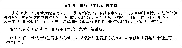 第二節(jié) 醫(yī)療衛(wèi)生 公共醫(yī)療衛(wèi)生。全面恢復(fù)州、縣、鄉(xiāng)、村四級(jí)基本醫(yī)療、公共衛(wèi)生服務(wù)體系,恢復(fù)重建州縣兩級(jí)醫(yī)療和疾病預(yù)防控制、婦幼保健、衛(wèi)生監(jiān)督、食品藥品檢驗(yàn)機(jī)構(gòu),以及鄉(xiāng)鎮(zhèn)衛(wèi)生院、村衛(wèi)生室。加強(qiáng)鼠疫、碘缺乏病、包蟲(chóng)病、大骨節(jié)病、高原心肺病等傳染病和地方病防治能力建設(shè),提高醫(yī)療衛(wèi)生應(yīng)急處置能力。統(tǒng)籌民營(yíng)醫(yī)療機(jī)構(gòu)恢復(fù)重建。加強(qiáng)中醫(yī)和藏醫(yī)醫(yī)療服務(wù)體系建設(shè),積極扶持藏醫(yī)藥發(fā)展。 計(jì)劃生育。恢復(fù)重建計(jì)劃生育服務(wù)機(jī)構(gòu)。加強(qiáng)基層計(jì)劃生育、婦幼保健與其他醫(yī)療衛(wèi)生服務(wù)資源的有效整合。鄉(xiāng)鎮(zhèn)計(jì)劃生育服務(wù)用房與鄉(xiāng)鎮(zhèn)衛(wèi)生院統(tǒng)一建設(shè),健全功能、優(yōu)化管理。村計(jì)生室和衛(wèi)生室在村級(jí)公共服務(wù)設(shè)施中統(tǒng)籌考慮建設(shè)。適當(dāng)配置計(jì)劃生育流動(dòng)服務(wù)車,增強(qiáng)服務(wù)能力。 重建期醫(yī)療衛(wèi)生服務(wù)。建設(shè)臨時(shí)醫(yī)療衛(wèi)生服務(wù)設(shè)施,配置高壓氧艙、制氧站、急救設(shè)備和移動(dòng)實(shí)驗(yàn)室等必要設(shè)備。合理安排醫(yī)療救治、衛(wèi)生防疫和衛(wèi)生監(jiān)督人員。做好鼠疫、高原病的防治,抓好重點(diǎn)地區(qū)、重要環(huán)節(jié)的防疫工作,保障恢復(fù)重建階段醫(yī)療衛(wèi)生服務(wù)需求。 醫(yī)療衛(wèi)生隊(duì)伍建設(shè)。與相關(guān)政策相銜接,加強(qiáng)專業(yè)技術(shù)人員、藏醫(yī)藥人才和鄉(xiāng)村醫(yī)生培養(yǎng)培訓(xùn)。合理補(bǔ)充衛(wèi)生專業(yè)技術(shù)人員,充實(shí)醫(yī)療衛(wèi)生機(jī)構(gòu)專業(yè)人才隊(duì)伍。按照醫(yī)護(hù)人員編制的合理比例,建設(shè)周轉(zhuǎn)住房。