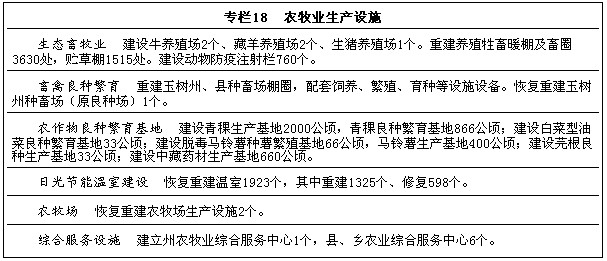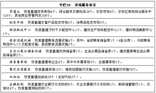 第三節 市場服務體系 商貿流通設施。發揮結古鎮的區位優勢,繼承歷史商貿傳統,建設區域商貿流通中心。優先恢復重建保障災區群眾基本生活的商貿流通服務網點,建設農畜產品、消費品批發市場、農貿市場及生產、生活資料配送中心等流通基礎設施。 服務網點。優化城鄉服務設施網點布局,根據城鄉建設規劃,適度增加服務網點數量,支持民族貿易網點建設。恢復重建加油站。加強現代物流配送設施和信息網絡建設,提高商貿、物流服務水平。 儲備設施。恢復重建糧食儲備庫和糧食加工廠,適當增加糧油供應網點(含軍糧)、糧食批發市場。建設肉類、蔬菜等生活必需品儲備倉庫。 金融服務。恢復重建農業銀行、農業發展銀行、郵政儲蓄銀行分支機構及保險業分支機構,支持農村信用合作社恢復重建,建設營業用房、金庫和金融網絡信息系統等設施。合理布局基層金融服務網點,鼓勵商業銀行和保險公司設立分支機構,方便群眾生產生活,為災區經濟發展提供支持。