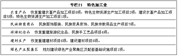 第四節 特色加工業 農牧產品加工。以滿足本地和周邊市場需求為重點,促進公司、基地、農牧戶相結合,積極發展肉、乳、青稞等產品加工,提高精深加工水平。在保護生態和資源的前提下,發展冬蟲夏草等藥用生物資源加工生產,提高產品附加值。 民族手工業。加快民族佩飾、服裝、特色家具、家飾等民族特需品生產恢復,滿足群眾的生活需要。做好唐卡、佛像等宗教用品的生產恢復。以旅游業發展為契機,積極發展石刻、剪紙、羊皮畫、編織、藏繡、藏毯等特色旅游紀念品的生產加工。支持中小企業和民族特色手工業發展,繁榮民族工業,帶動群眾增收致富。 建筑材料。根據當地災后恢復重建和經濟發展,優先恢復建材生產企業,建設水泥粉磨站、混凝土攪拌站以及商品混凝土預制、新型墻體材料、節能門窗等建材企業。加強廢舊建筑材料、建筑垃圾的綜合利用,生產新型節能環保建筑材料。結合地質災害整治,規范砂石料生產,避免破壞生態。 綠色產業聚集區。結合結古鎮的恢復重建,按照合理布局、集聚發展、節約用地的原則,規劃建設綠色產業聚集區,合理確定聚集區規模。加工類企業的恢復重建、新建原則上應入區建設。嚴格準入條件和環保要求,合理確定產業發展規模,高起點、高標準建設,發展循環經濟和綠色經濟。