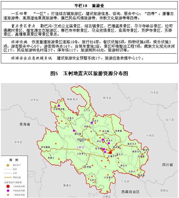 第二節 旅 游 業 旅游設施。圍繞“一區四帶”旅游布局,恢復重建重點旅游景區景點。結合災后交通基礎設施建設,改善重要旅游通道交通條件。建設旅游安全應急救援系統,修復旅游服務設施,提高旅游服務水平。 旅游產品。加強旅游市場培育和宣傳,建立和完善旅游市場營銷體系,開發歷史文化、民俗風情、高原自然風光等特色旅游產品,發展藏家樂旅游。
