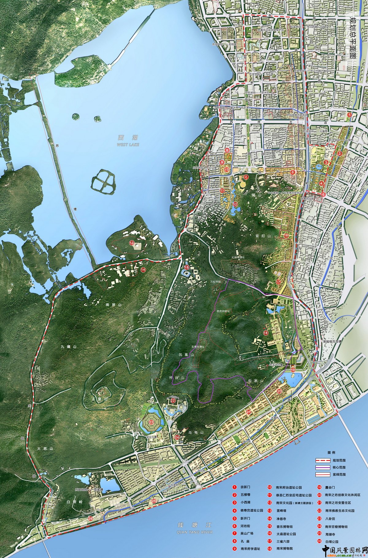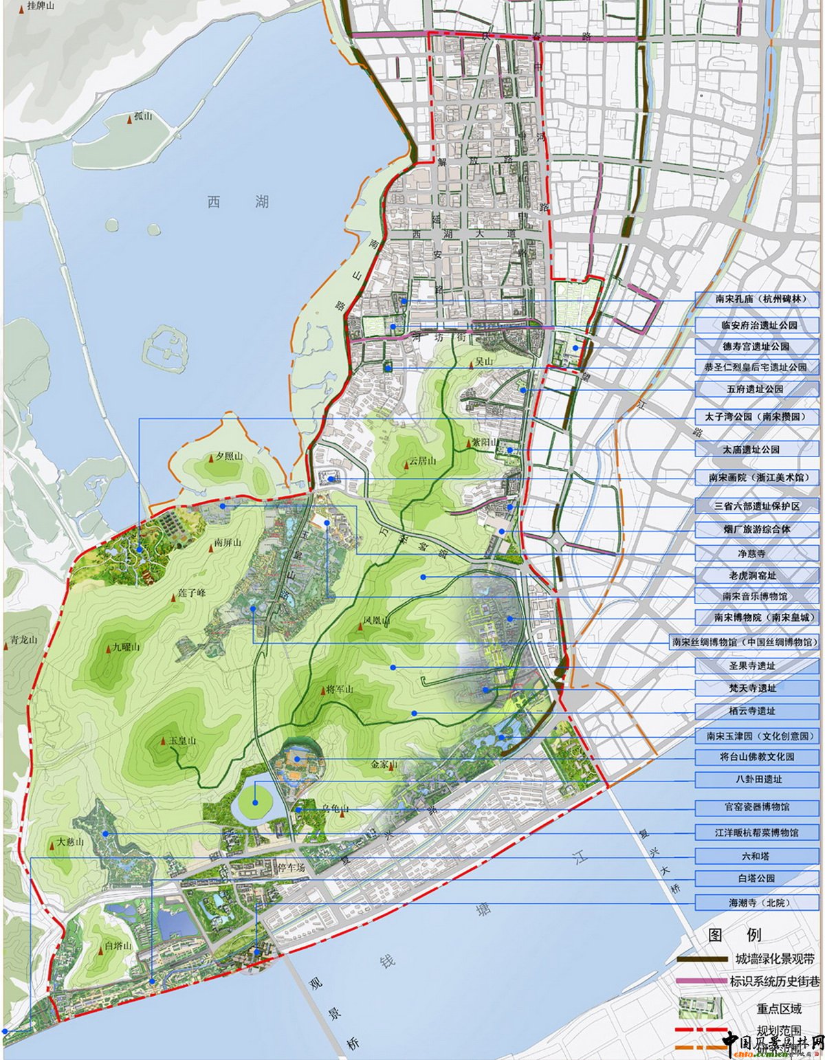 方案B: ![]() ![]() 按照文化結構區分,南宋皇城大遺址公園將有“一心、三區、四核、五軸、12個綜合保護片區”。“一心”指南宋博物院;“三區”指湖濱休閑區、皇城文化區、江濱協調區;“四核”包括南宋皇宮及嘉會門南、德壽宮及周邊城墻門、太廟與三省六部、府治與皇后宅。“五軸”包括御文化縱軸(御街)、御文化橫軸(河坊街)、現代文化軸(延安路)、西湖文化軸(南山路)、水文化軸(中河);“12個綜合保護片區”則包括府治綜合保護片區、湖濱綜合保護片區、中山中路綜合保護片區、玉皇山路藝術文化綜合保護片區等等。 每個片區的設計,都有自己的特色。比如核心片區之一的府治片區,將展示臨安府治、府學、皇后宅,恢復與西湖連通的清湖河,沿山新建南宋文化主題游園;德壽宮片區主要是展示德壽宮保存較好的南部片區,并打算恢復展示“小西湖”;嘉會門片區,將通過嘉會門至錢塘江的視線廊道等,實現南宋皇宮到現代城市的過渡。 該方案還提出,新增八處綜保工程,包括府治府學(含皇后宅)綜保工程、清湖河綜保工程、中河綜保工程、德壽宮綜保工程、南宋文化園綜保工程、城墻城門綜保工程、太廟綜保工程、嘉會門地區綜保工程等。 另一個“晉級”的是E方案,該方案重點針對對文化遺產的保護,并對目前存在的問題進行了分析。