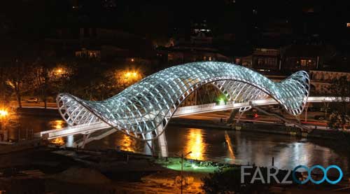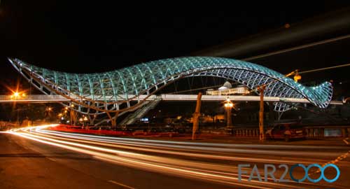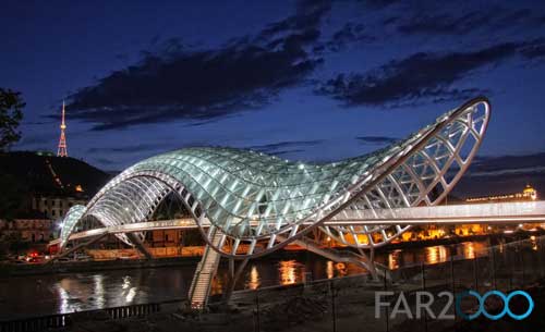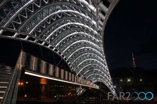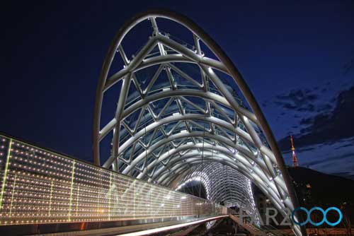 跨越第比利斯Mtkvari河的新步行橋“和平橋”是由意大利建筑師Michel De Lucchi和法國照明設(shè)計(jì)師Philippe Martinaud設(shè)計(jì)的。這座用玻璃和鐵建造的步行橋連接了第比利斯老區(qū)和新區(qū),并設(shè)有一個(gè)150米高的頂棚。5月6日,步行橋正式開放,并成為第比利斯的一個(gè)現(xiàn)代設(shè)計(jì)地標(biāo)。 從橋上可以看到Metekhi教堂和Narikala要塞以及Baratashivili橋和總統(tǒng)住所等。它安裝了一個(gè)交互式的燈光顯示系統(tǒng),包括3萬個(gè)LED燈和240個(gè)傳感器,每小時(shí)根據(jù)特殊的信號(hào)沿著橋梁的兩個(gè)護(hù)墻依次閃爍,很像是莫爾斯電碼,象征著人體的化學(xué)元素以及人類的生命與和平。這座閃閃發(fā)亮的橋梁以其海洋生物般的外形匍匐在河上,具有近乎生物學(xué)的外觀。 在開放儀式上,格魯吉亞總統(tǒng)Mikheil Saakashvili表示,這座橋梁是格魯吉亞從過去走向未來的標(biāo)志,是歷史與現(xiàn)代之間的橋梁,同時(shí)體現(xiàn)出政府管理的特點(diǎn):透明、靈活、果斷和現(xiàn)代性。