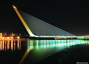 ![]() 1992年,是哥倫布發現美洲500周年,為此,西班牙政府在塞維利亞舉辦了世博會,其標志性建筑是被譽為經典的阿拉米羅大橋。整座大橋猶如一只昂首的天鵝或一架巨大的白色豎琴。
