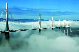 ![]() 被稱為“世界第一橋”的法國米洛高架大橋可以說是人類建筑的奇跡,跨越塔恩河谷,車輛行駛在其間有如穿越云端一般。全長達2.46公里,卻只用7個橋墩支撐。大橋最高點達到343米,超過埃菲爾鐵塔23米。