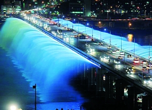 ![]() ![]() 盤浦大橋上的“月光彩虹噴泉”很有特色,總長達1140米,共安裝了380個噴口。白天和夜晚,彩虹噴泉演繹出不同的風光。