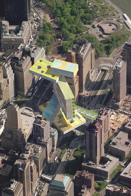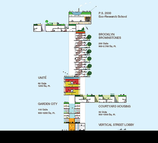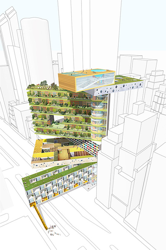 “Plugout”是美國建筑事務所workac受紐約市區聯盟委托所做的設計。這個項目的基地是曼哈頓下城一處未被充分利用的地塊。workac事務所為業主提供了一系列實驗性的新型建筑區塊,然后將各類型區塊堆疊成一座45層的高樓。每一種類型塊都是一個獨立的區域,并繞著建筑核心旋轉,以便能更多的享受到陽光和周邊景色。不僅如此,每一個獨立體塊的屋頂都有一個不同的生態體系。 ![]() “plugout”這個方案的概念就是希望設計一座可以為社區提供必要的生態基礎設施的獨立建筑,也就是說,從城市網格中脫離,進而扮演所謂“城市透析”的角色,過濾并清潔水體并提供能源,然后將這些再返回給周邊地區。塔樓的核心區在結構上連接著各個不同區塊以及垂直方向上的交通并提供相關基礎設施。這個核心區分為廢物區和水系統,其中一個系統下移,而供熱系統將另一部分上移,交叉的部分則作為公共空間使用。 在水循環系統和廢物系統這一區域,被收集的雨水可以用來沖廁所,灌溉,洗滌以及水產養殖。生活污水在生活污水處理池中過濾然后再利用,作為沖廁水和灌溉用水。而最不清潔的污水在水處理設施中經過過濾和循環之后再移送到建筑的能源系統中。供暖和能源系統通過堆肥,即一個“垃圾焚化爐”來實現,提供地熱。而太陽能外立面,風力渦輪機和一個熱電廠則為社區提供了一個公共浴池,一個高溫瑜珈中心并為城市中的無家可歸者提供了一個暖房。在這座建筑的頂部是一所生態研究學校,PS2030(為紀念市長頒布的紐約發展計劃planyc2030)。