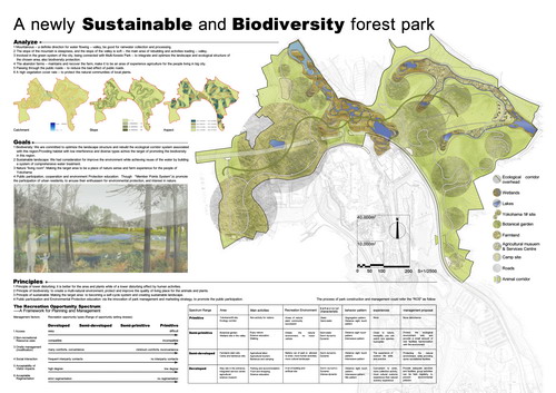 二等獎:A newly sustainable and biodiversity forest park(動植物天堂,綠色后花園) 設計人員:許曉明 劉麗 王鑫 指導教師:劉志成 王向榮 李雄