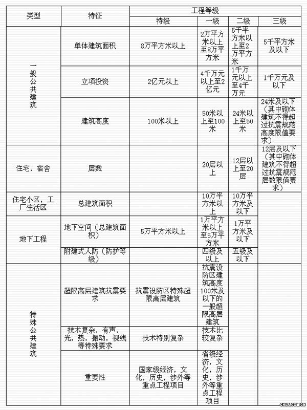 建設[1999]9號 一、總 則 ( 一 ) 根據《中華人民共和國建筑法》和《建設工程勘察和設計單位資質管理規定》 ( 建設部第 60 號令 ), 結合建筑工程設計實際情況 , 特制定本標準。 ( 二 ) 本標準中建筑工程設計是指民用建筑和一般工業建筑的總平面設計與單體設計。即建筑用地紅線范圍內的室外工程設計、建筑物構筑物設計、結合城市建設與民用建筑修建的地下工程設計及住宅小區、工廠廠前區、工廠生活區設計等 , 以及上述建筑工程所包含的所有相關專業的設計內容 , 如總平面、布置、豎向設計、各類管網管線設計、園林綠化設計、室內外環境設計與裝修、動力、煤氣、道路、消防、保安、通信、防雷、建筑智能化設施等設計內容。 ( 三 ) 建筑工程設計資質分為甲、乙、丙三個級別 , 邊遠地區及經濟不發達地區如確有必要設置丁級設計資質 , 需經省、自治區、直轄市建設行政主管部門報建設部同意后方可批準設置。 二、分級標準 (一) 甲級 1 、從事建筑設計業務 6 年以上 , 獨立承擔過不少于 5 項工程等級為一級或特級的工程項目設計并已建成 , 無設計質量事故。 2 、單位有較好的社會信譽并有相適應的經濟實力 , 工商注冊資本不少于100 萬元。 3 、單位專職技術骨干中建筑、結構和其他專業人員各不少于 8 人、 8 人、10 人 ; 其中一級注冊建筑師和一級注冊結構工程師均不少于 3 人。 4 、獲得過近四屆省級建設行政主管部門評優及以上級別評優的優秀建筑設計三等獎及以上獎項不少于 3 項 , 參加過國家或地方建筑工程設計標準、規 范及標準設計圖集的編制工作或行業的業務建設工作。 5 、推行全面質量管理 , 有完善的質量保證體系 , 技術、經營、人事、財務、檔案等管理制度健全。 6 、達到國家建設行政主管部門規定的技術裝備及應用水平考核標準。 7 、有固定的工作場所 , 建筑面積不少于專職技術骨干每人 15 平方米。 ( 二 )乙級 1 、從事建筑設計業務 4 年以上 , 獨立承擔過不少于 3 項工程等級為二級及以上的工程項目設計并已建成 , 無設計質量事故。 2 、單位有社會信譽以及相適應的經濟實力 , 工商注冊資本不少于 50 萬元。 3 、單位專職技術骨干中建筑、結構和其他專業人員各不少于 6 人、 6 人、8 人 ; 其中一級注冊建筑師和一級注冊結構工程師均不少于 1 人。 4 、曾獲得過市級建設行政主管部門評優及以上級別評優的優秀建筑設計三等獎及以上獎項不少于 2 項。 5 、有健全的技術、質量、經營、人事、財務、檔案等管理制度。 6 、達到國家建設行政主管部門規定的技術裝備及應用水平考核標準。 7 、有固定的工作場所 , 建筑面積不少于專職技術骨干每人 15 平方米。 ( 三 )丙級 1 、從事建筑設計業務 3 年以上 , 獨立承擔過不少于 3 項工程等級為三級及以上的工程項目設計并已建成 , 無設計質量事故。 2 、單位有社會信譽以及必要的經營資本 , 工商注冊資本不少于 20 萬元。 3 、單位專職技術骨干人數不少于 10 人 ; 其中三級注冊建筑師不少于 3 人 ( 或一級注冊建筑師不少于 1 人 ), 二級注冊結構工程師不少于 3 人 ( 或一級注冊結構工程師不少于 1 人 ) 。 4 、有必要的技術、質量、經營、人事、財務、檔案等管理制度。 5 、計算機數量達到專職技術骨干人均 0.8 臺 , 計算機施工圖出圖率不低于 75% 。 6 、有固定的工作場所 , 建筑面積不少于專職技術骨干每人 15 平方米。 三、承擔任務范圍 ( 一 ) 、甲級 承擔建筑工程設計項目的范圍不受限制。 ( 二 ) 、乙級 1 、民用建筑 : 承擔工程等級為工級及以下的民用建筑設計項目。 2 、工業建筑 : 跨度不超過 30 米、吊車噸位不超過 30 噸的單層廠房和倉庫 , 跨度不超過 12 米、 6層及以下的多層廠房和倉庫。 3 、構筑物 : 高度低于 45 米的煙囪 , 容量小于 100 立方米的水塔 , 容量小于 2000 立方米的水池 , 直徑小于 12 米或邊長小于 9 米的料倉。 ( 三 ) 丙級 1 、民用建筑 : 承擔工程等級為三級的民用建筑設計項目。 2 、工業建筑 : 跨度不超過 24 米、吊車噸位不超過 10 噸的單層廠房和倉庫 , 跨度不超過 6 米、樓蓋無動荷載的 3層及以下的多層廠房和倉庫。 3 、構筑物 : 高度低于 30 米的煙囪 , 容量小于 80 立方米的水塔 , 容量小于 500 立方米的水池 , 直徑小于 9 米或邊長小于 6 米的料倉。 四、附 則 ( 一 ) 幾點說明 : l 、本標準中各工程等級均以附表所列特征為準劃定。 2 、“ 專職技術骨干 ”系指下列人員之一 : 3 、依據附表不能確定工程等級時 , 省、自治區、直轄市建設行政主管部門有權根據實際情況確定其工程等級。 ( 二 ) 、本標準自 1999 年 2 月 1 日起實行 , 以前發布的建筑行業工程設計資格分級標準和其他有關文件中的要求如與本標準有不符之處的以本標準為準。 ( 三 ) 、本標準由建設部勘察設計司負責解釋。 附件:民用建筑工程設計等級分類表 ![]()